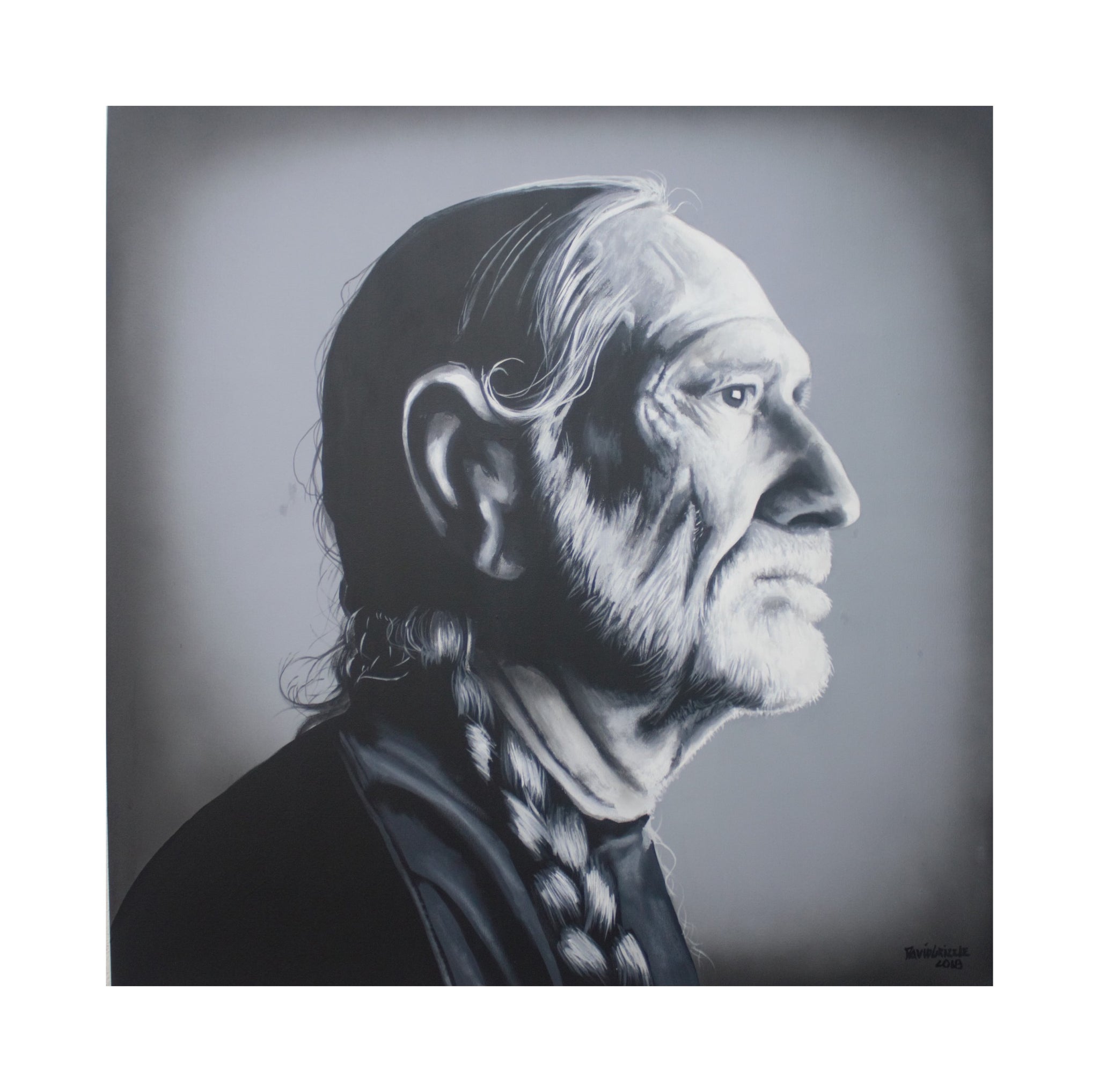 Willie Nelson Black and White by David Grizzle! Decorate your home or office with the photo realistic print of the legend, based off of David's 2018 3ft by 3ft Acrylic on Canvas Painting!